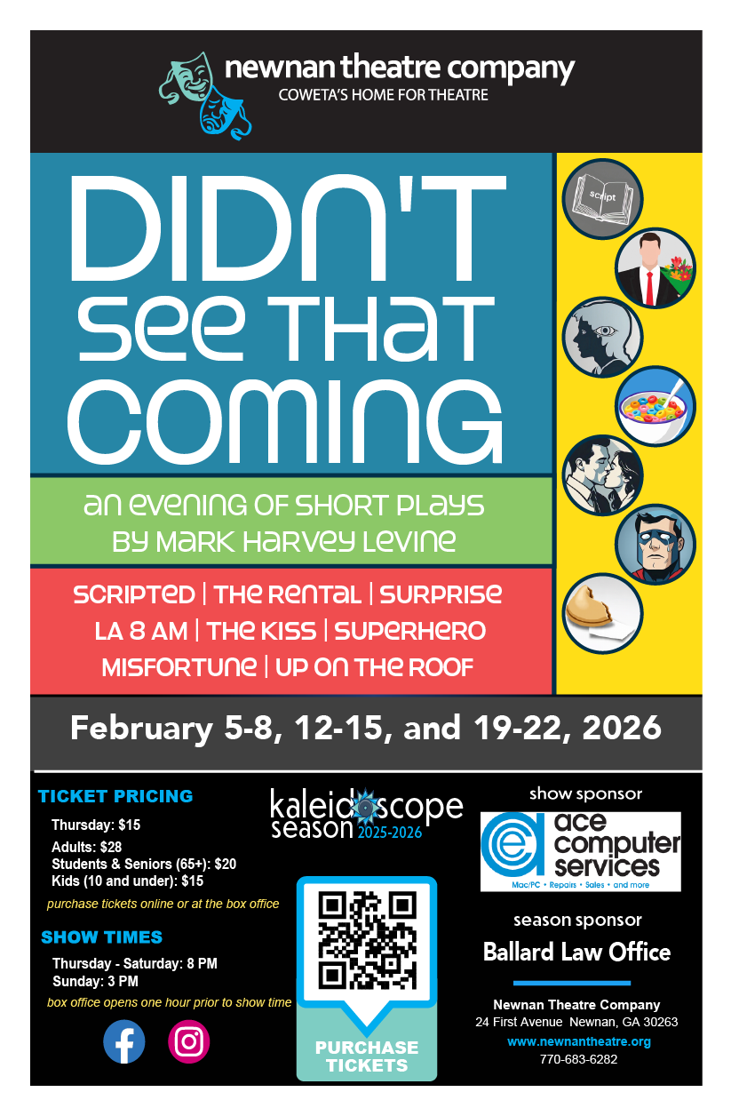What do a fortune cookie, a superhero, a rentable boyfriend, and a magical script have in common? Find out in Newnan Theatre Company’s production of Didn’t See That Coming by Mark Harvey Levine.