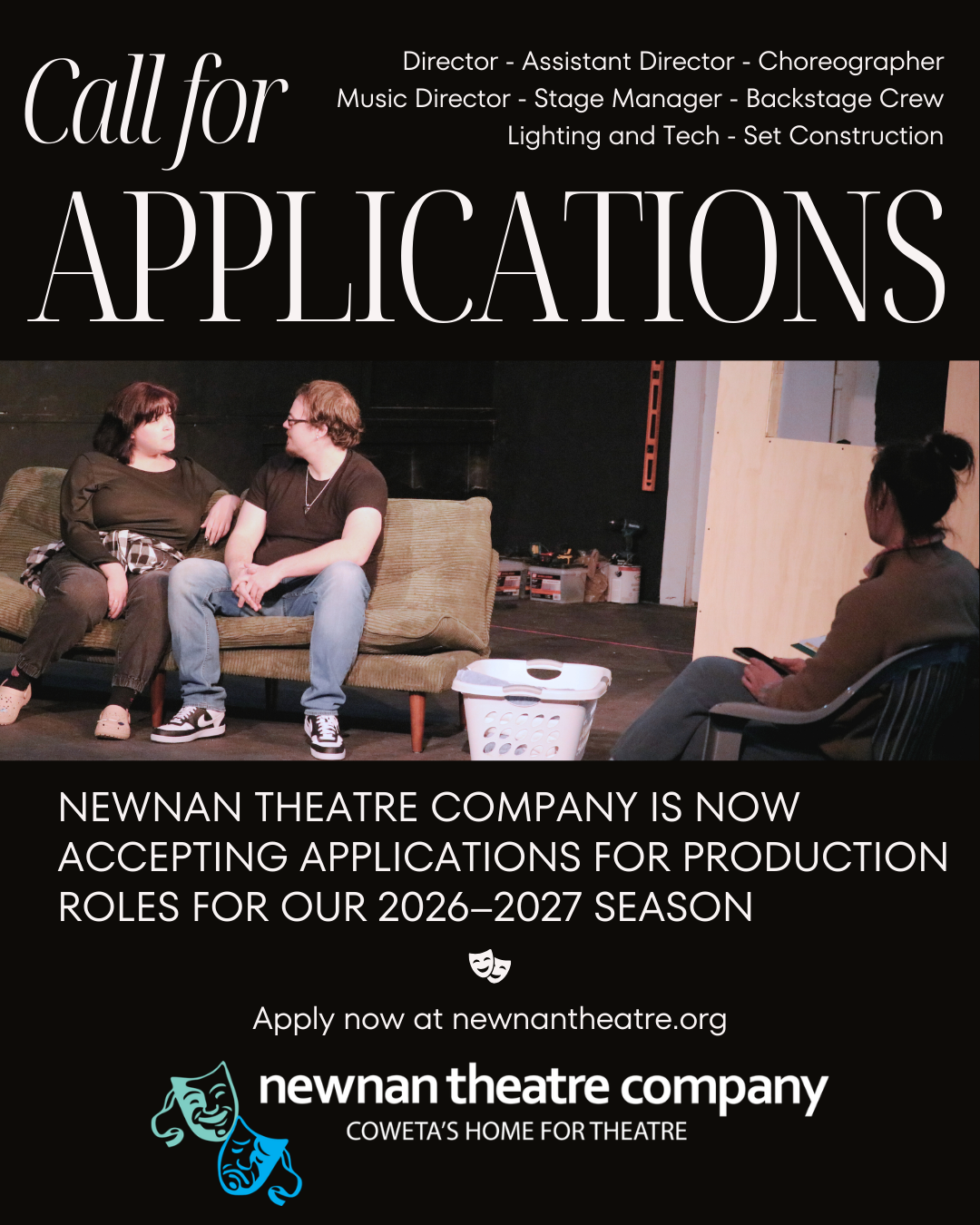 Newnan Theatre Company is now accepting applications for production roles for our 2026–2027 season. Join us behind the scenes as we bring another exciting year of theatre to life.